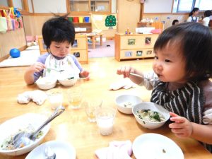 給食の時間になると、「~さん、パン切ってたね!」「~さんが作ってたんだよ」と話しながら、食べることに挑戦する子どもたちの姿もありました。